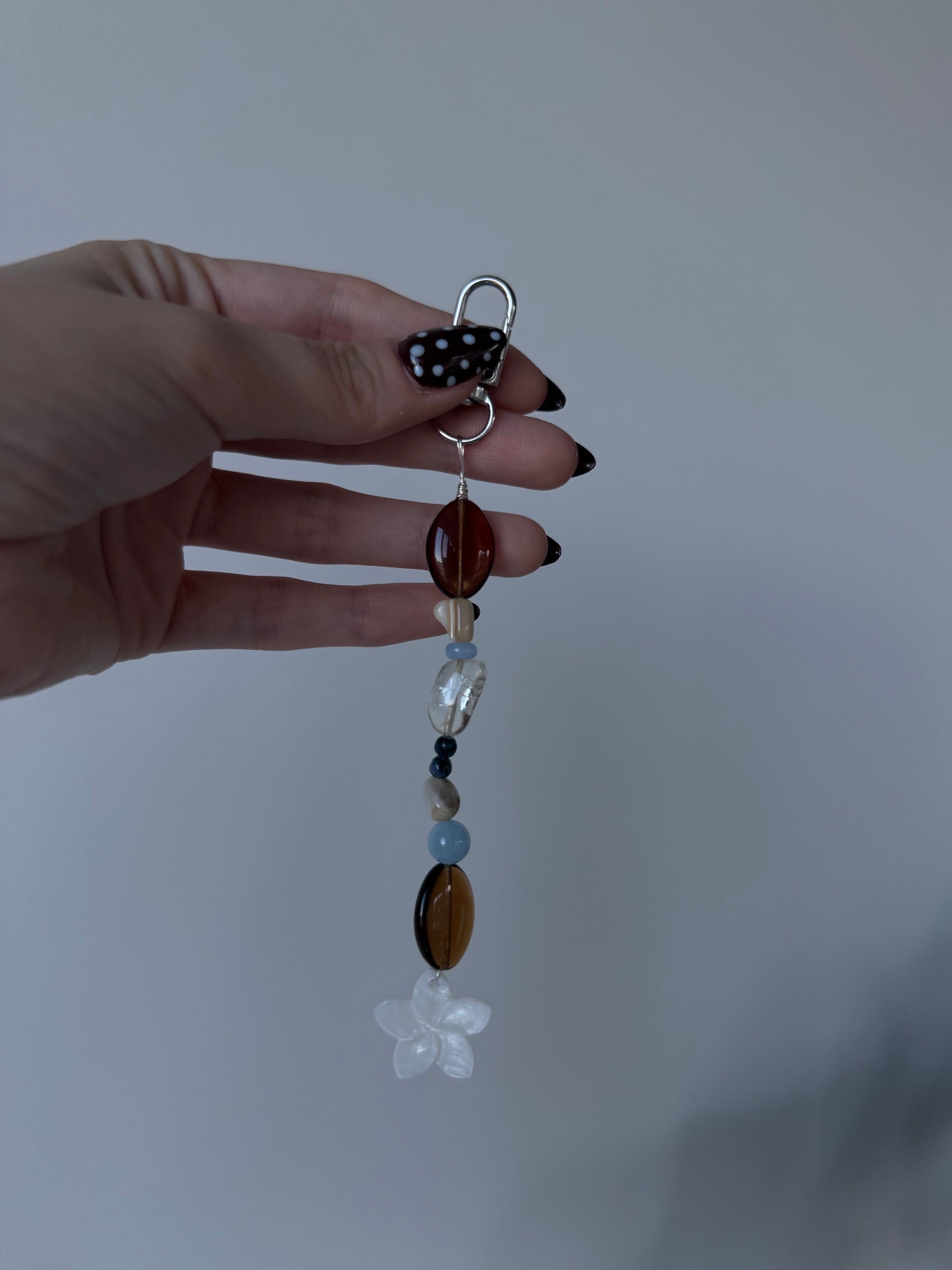 Inspiré par les rivages d’automne, Thalassa évoque le mouvement lent des vagues et la lumière dorée des fins de journée. Ses perles d’eau douce se mêlent à des reflets chauds, rappelant les éclats du soleil sur l’eau avant le crépuscule. Un détail apaisant et intemporel à suspendre à votre sac.