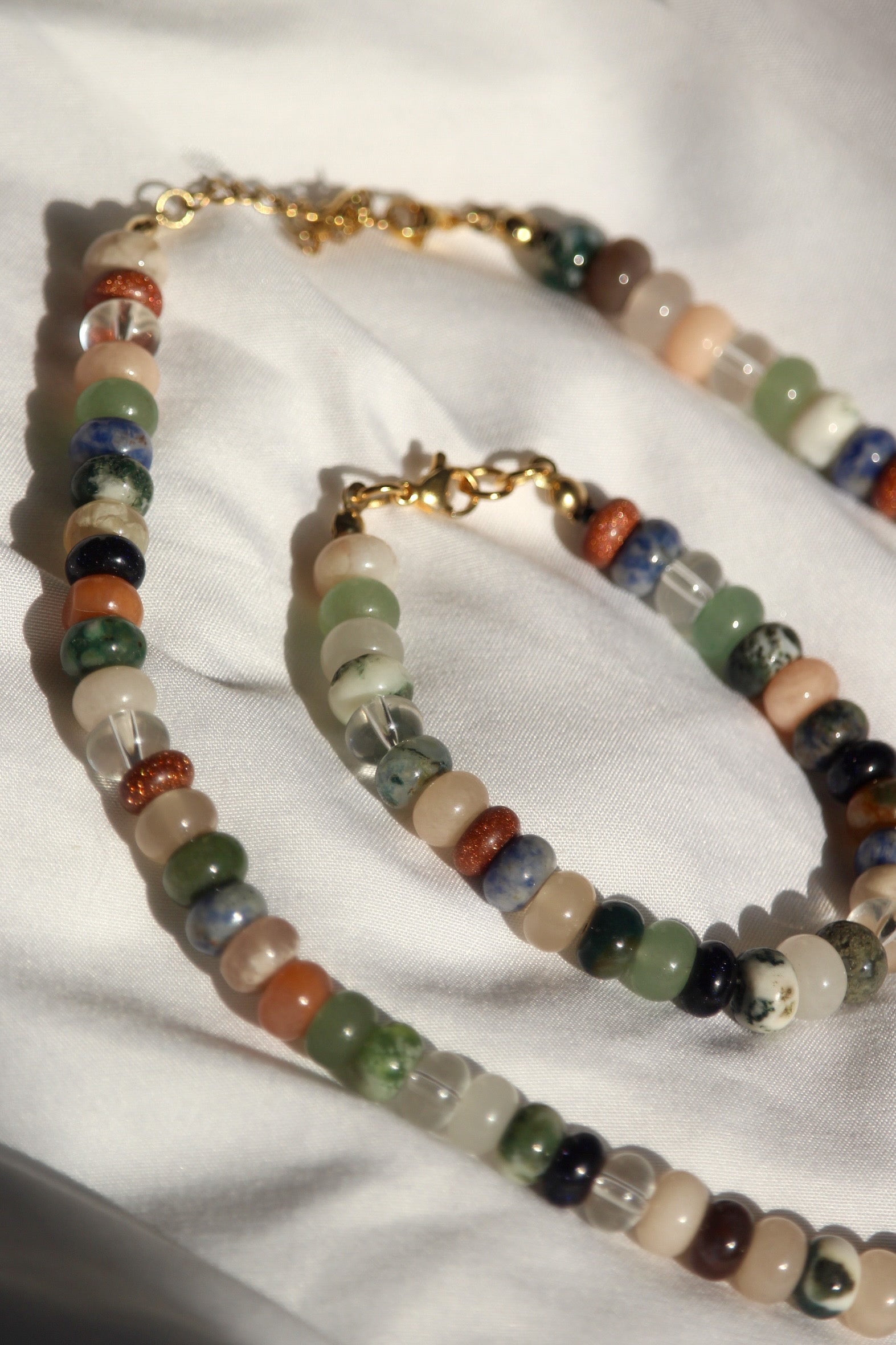 Conçu comme le compagnon idéal du collier Chelona, ce bracelet réunit un mélange harmonieux de pierres naturelles, chacune portant sa propre histoire et son énergie. Disponible avec une attache dorée ou argentée, il complète parfaitement le collier pour un duo authentique et lumineux.