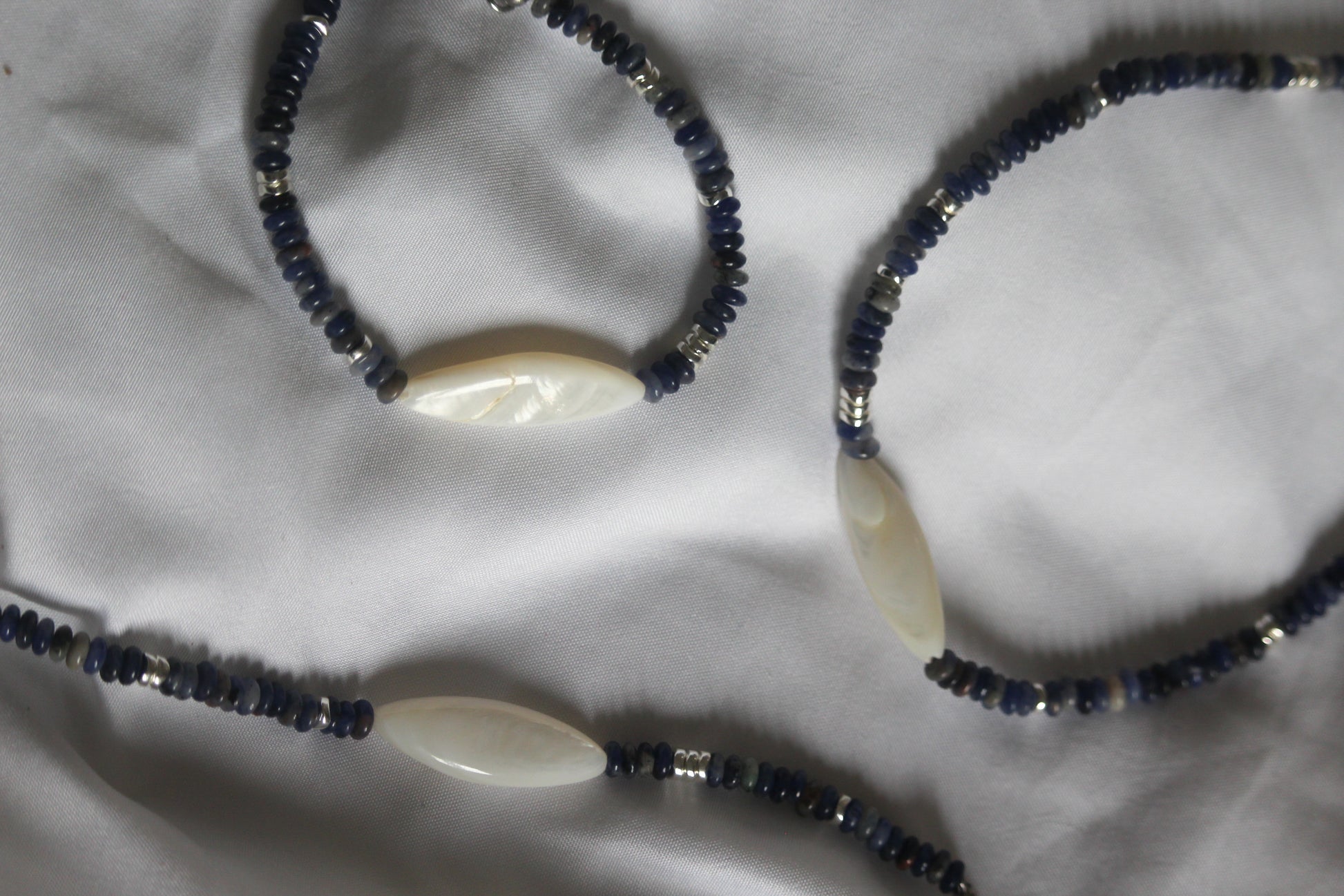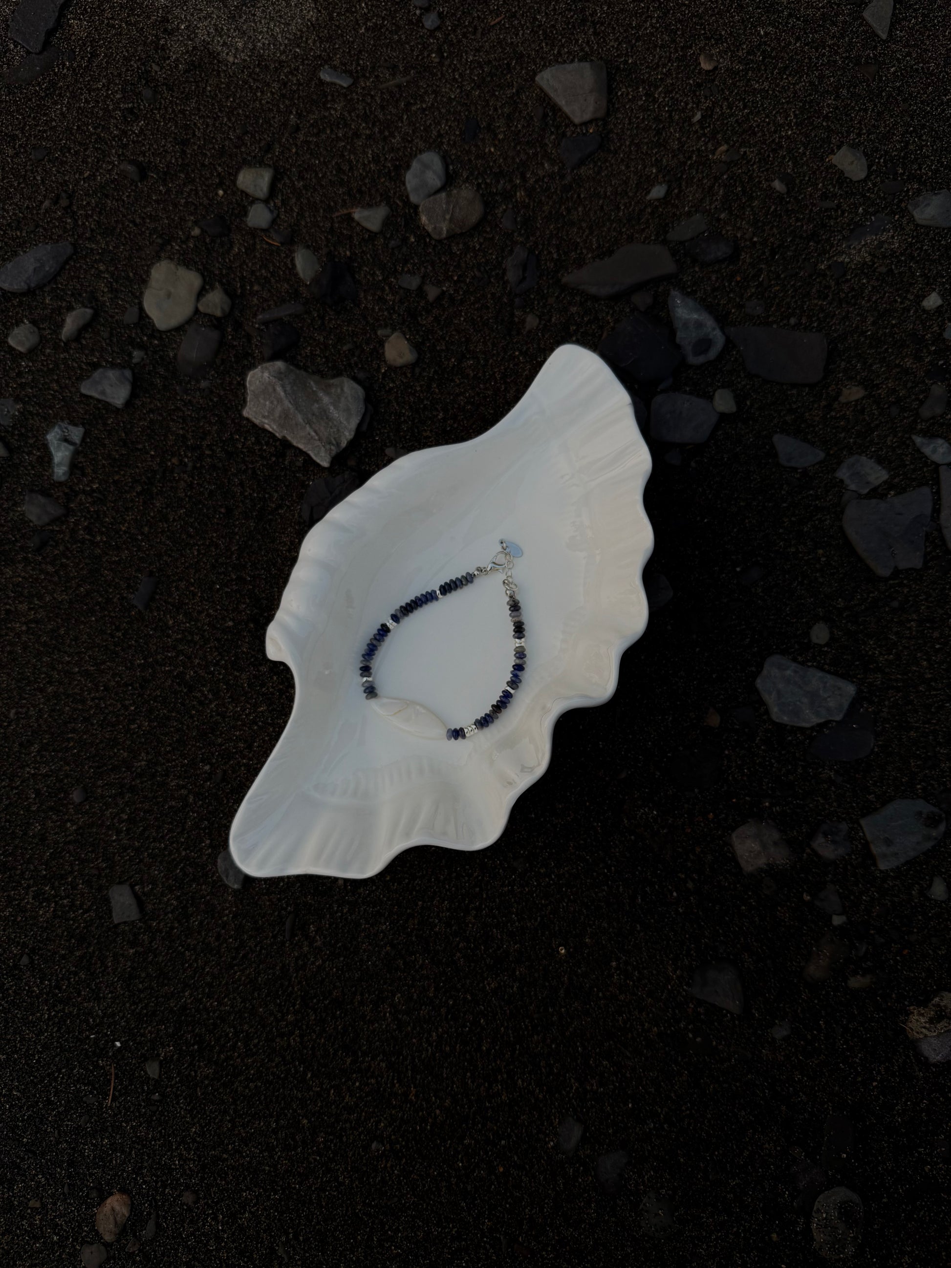 Conçu comme le compagnon idéal du collier Zoe, ce bracelet mêle coquillage naturel et sodalite aux nuances profondes, rehaussé de délicates touches argentées.