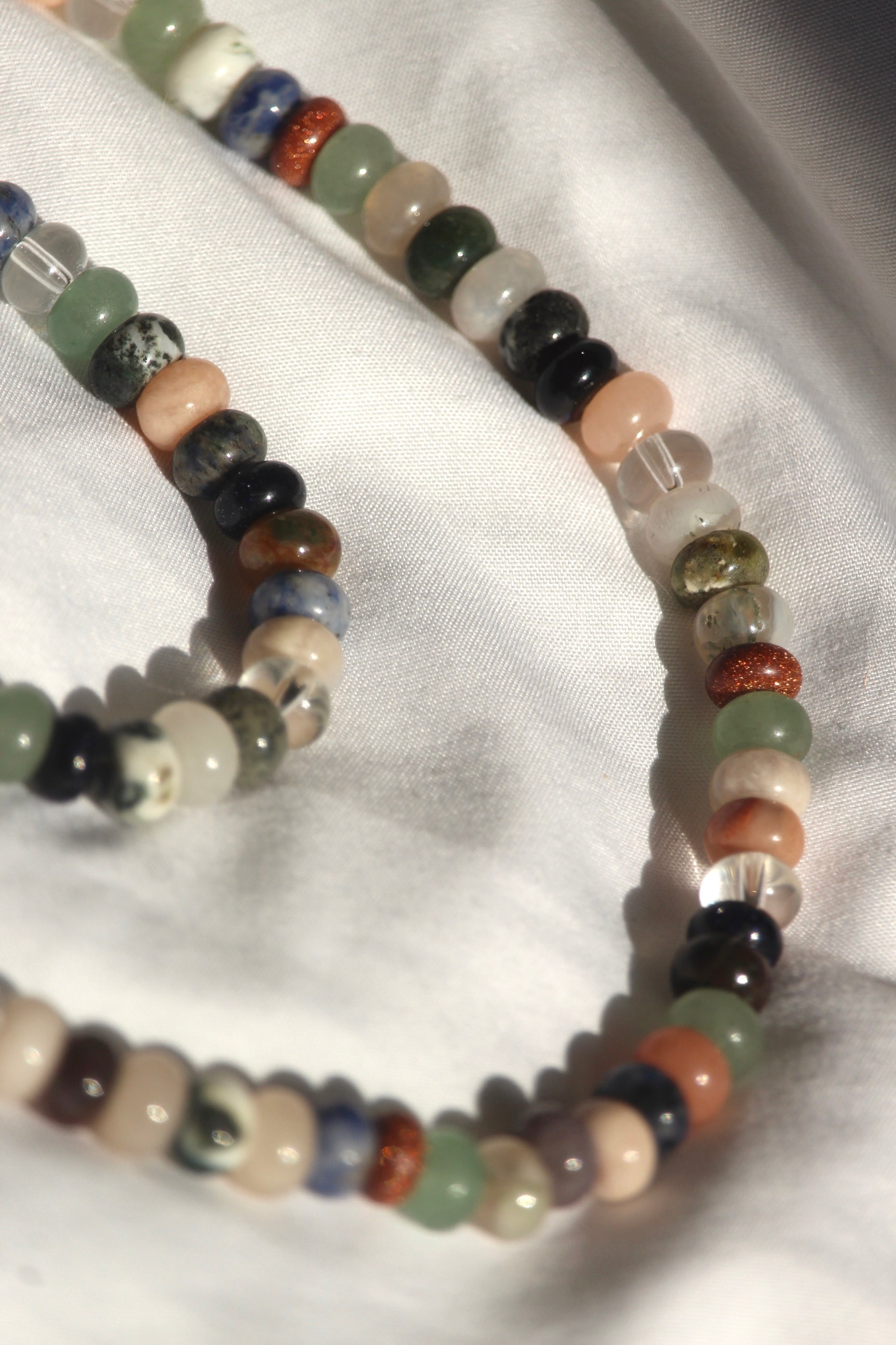 Détails : 45 cm + chaîne ajustable / Pierres naturelles variées / Vertus : équilibre, protection, créativité.