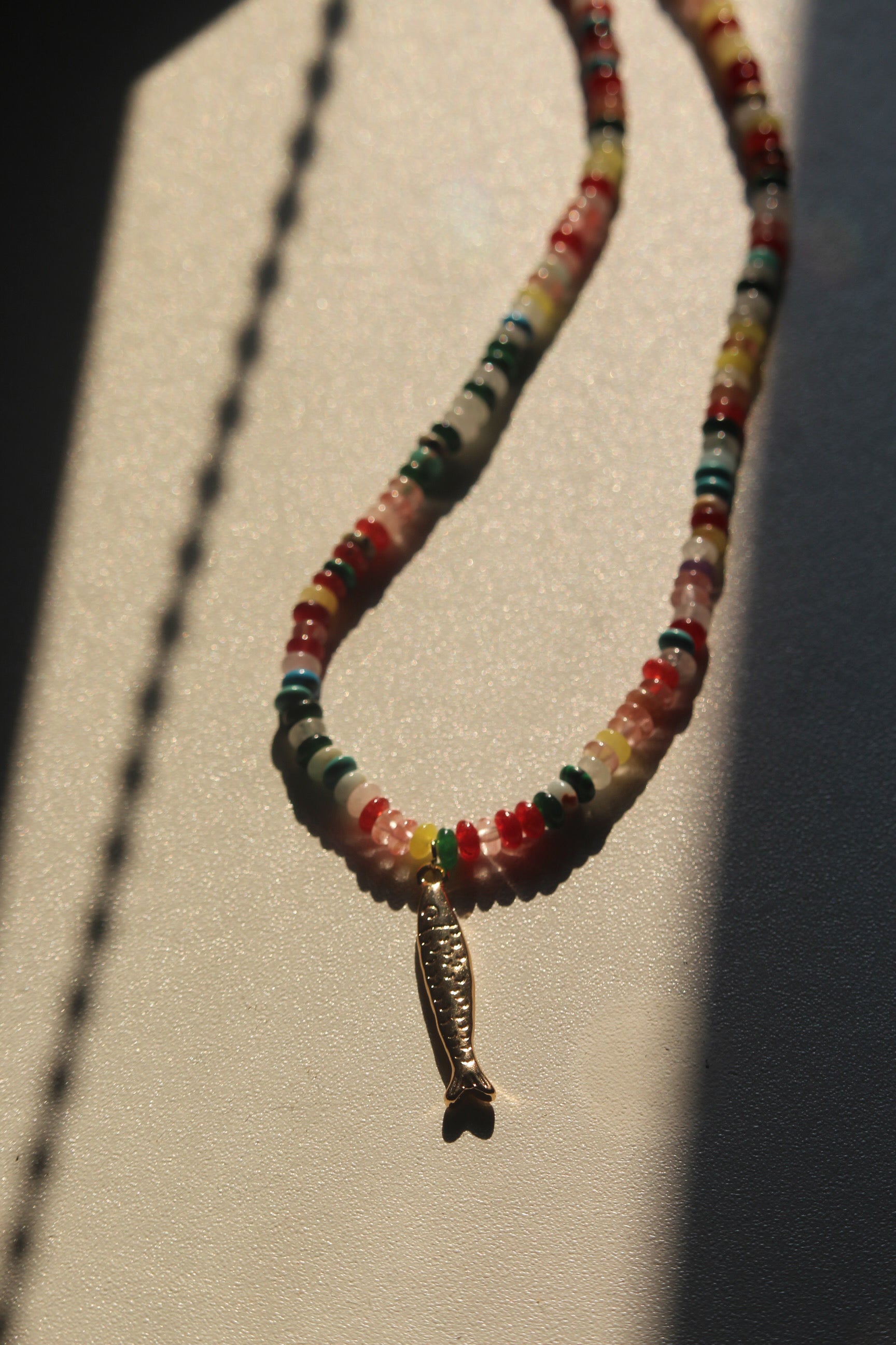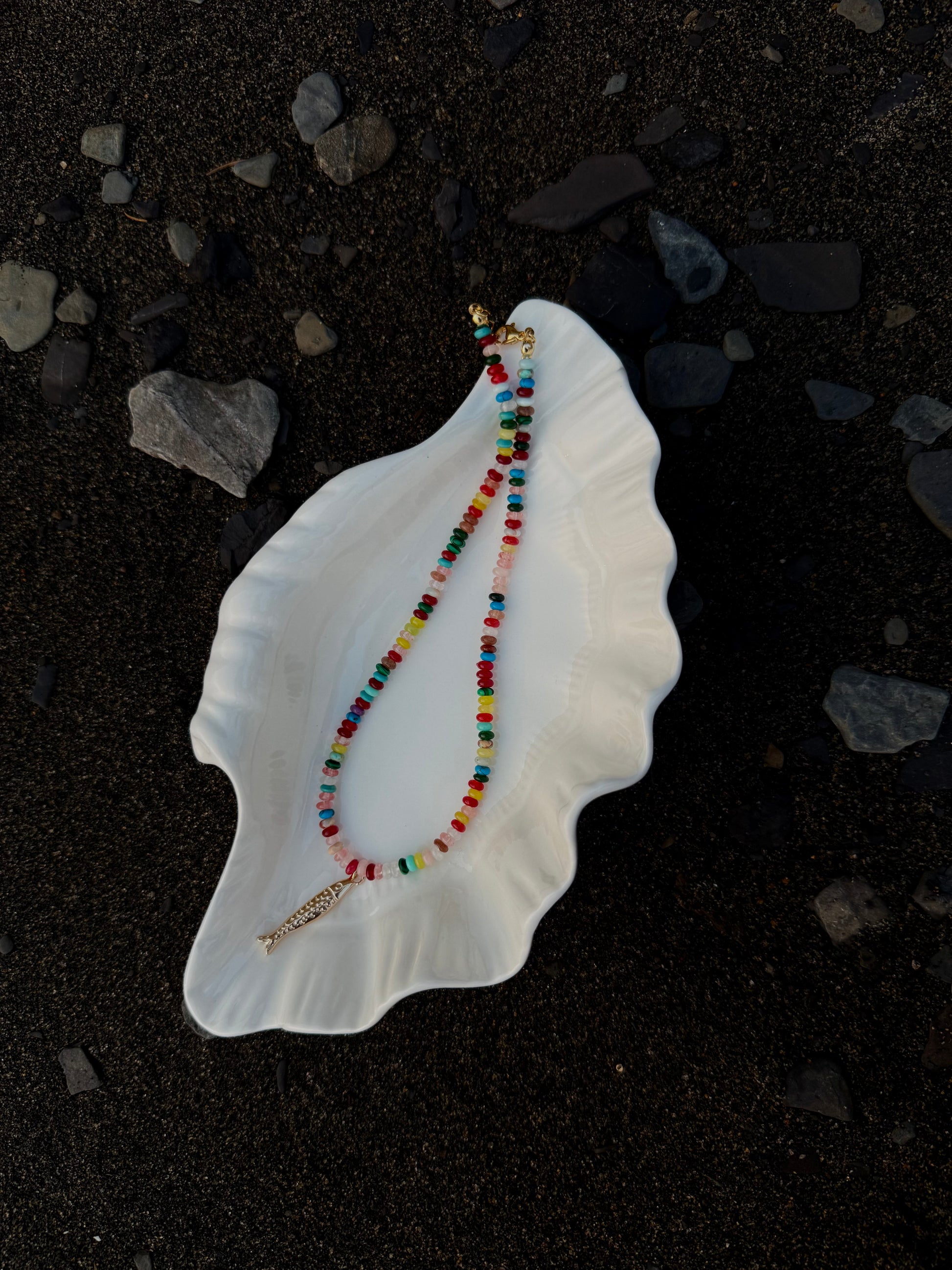 Comme une brise venue de la mer Égée, le collier Psari associe des pierres naturelles aux teintes variées à un pendentif doré en forme de petite sardine, symbole de liberté et d’audace. Sa finition dorée éclatante illumine le teint et attire le regard.