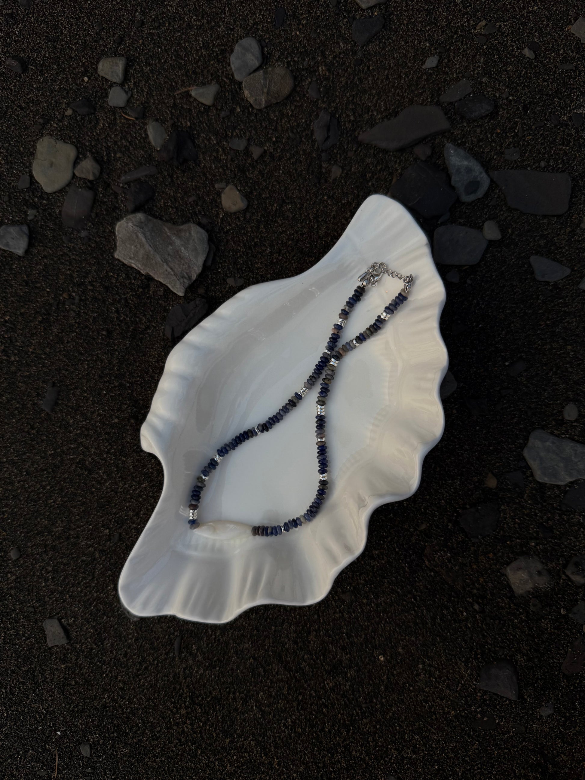 Comme un souffle marin figé dans le temps, le collier Zoe mêle coquillage naturel et sodalite aux nuances profondes, rehaussé de délicates touches argentées.